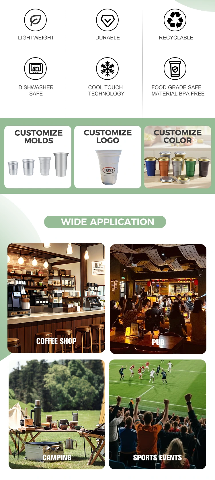 Cốc uống cà phê và bia bằng nhôm tùy chỉnh dùng một lần 16oz này có thể được đặt trực tiếp vào tủ lạnh để làm lạnh. Khi bảo quản đồ uống lạnh, tính dẫn nhiệt của chất liệu nhôm giúp duy trì nhiệt độ lạnh.