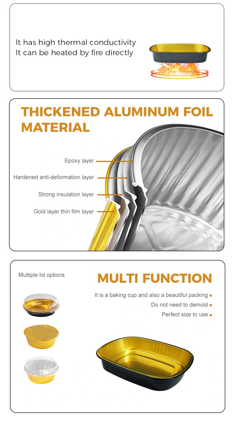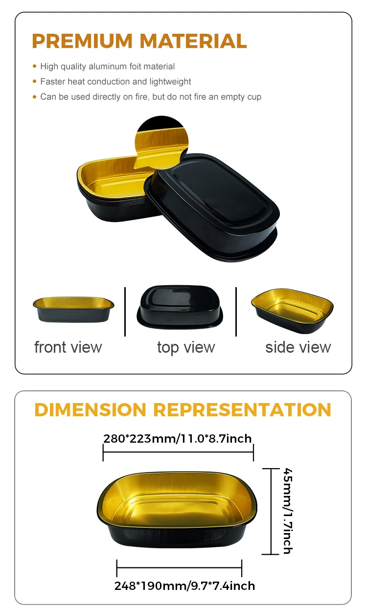 Nhà cung cấp giấy nhôm Yunchu Nhà cung cấp Vàng đen dùng một lần Viên chứa lá hình chữ nhật hình chữ nhật hình chữ nhật phù hợp cho các ngành công nghiệp phục vụ và món ăn lớn, đặc biệt là phù hợp cho các chuỗi sản phẩm, chuỗi sản phẩm có khả năng của FLEKAL, Vị trí, có thể được sử dụng với nắp niêm phong bằng nhôm và nắp PET hoàn toàn trong suốt, với hiệu suất niêm phong tuyệt vời, khả năng chống nhiệt độ cao và chức năng phòng chống rò rỉ và rò rỉ. Nó được sử dụng rộng rãi trong các kịch bản khác nhau như đóng gói thực phẩm, sưởi ấm, làm lạnh và giao hàng. Bề mặt áp dụng một thiết kế tường ánh sáng, với vẻ ngoài phẳng và mịn, thuận tiện cho việc niêm phong tự động của màng kín nhiệt, do đó cải thiện hiệu quả đóng gói.