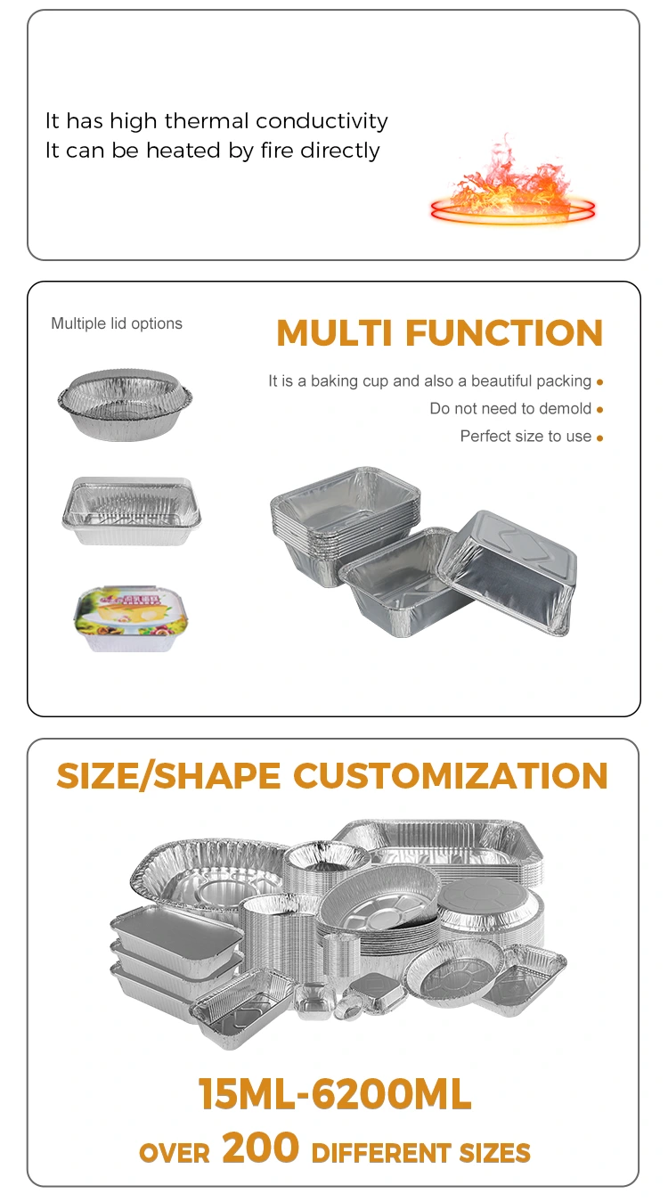 Hộp đựng giấy nhôm bạc dùng một lần cho nồi chiên không dầu hình chữ nhật của nhà sản xuất lá nhôm Yunchu được thiết kế cho nhu cầu nhà bếp, nướng bánh và phục vụ ăn uống thuận tiện. Nó sử dụng lá nhôm cấp thực phẩm làm nguyên liệu thô và được đóng dấu chính xác để đảm bảo an toàn, thiết thực và bảo vệ môi trường. Nó giải quyết hoàn toàn các vấn đề về việc dọn dẹp tẻ nhạt sau khi nướng, khả năng thích ứng của hộp đựng kém và mùi của nguyên liệu, giúp mỗi bữa ăn trở nên dễ dàng, không cần lo lắng, sạch sẽ và hiệu quả. Hộp đựng bằng nhôm bạc hình chữ nhật dùng một lần của nồi chiên không khí nướng có khả năng dẫn nhiệt nhất định, dẫn nhiệt đều và nhanh, có thể thích ứng chính xác với môi trường nhiệt độ cao của nồi chiên không khí. Nó có thể chịu được nhiệt độ khắc nghiệt từ -20°C đến 250°C. Nó có thể được đặt trực tiếp vào nồi chiên không dầu để làm nóng sau khi lấy ra khỏi tủ lạnh mà không cần thay hộp đựng. Chất liệu lá nhôm dày rất dai và không dễ biến dạng hay gãy. Nó tránh làm bẩn nồi bên trong của nồi chiên không khí và lò nướng, loại bỏ sự cần thiết của các bước làm sạch tẻ nhạt. Là sản phẩm sử dụng một lần nên có thể vứt đi sau khi sử dụng mà không cần vệ sinh, giúp bạn rảnh tay hoàn toàn. Đồng thời, vật liệu lá nhôm có thể được tái chế 100%.