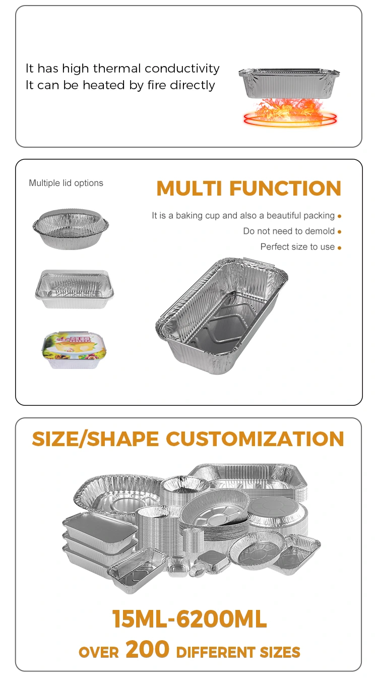 Các hộp đựng bằng nhôm nướng bằng bạc hình chữ nhật dùng một lần từ nhà cung cấp lá nhôm Yunchu là một công cụ nhà bếp đa năng phù hợp với các phương pháp nấu ăn khác nhau như nướng, nồi nóng, gratin, bao bì takeaway, v.v. Container này đủ nhỏ gọn để phù hợp với nhiều loại chậu và thiết bị, và có nhiều kích cỡ khác nhau để đáp ứng nhu cầu của các món nướng ngọn lửa mở khác nhau. Nó có thể được sử dụng để tạo ra các sản phẩm thực phẩm khác nhau, chẳng hạn như các loại thuốc xổ không khí và các ứng dụng thiết bị khác, khả năng chịu nhiệt và dầu, dễ nướng.