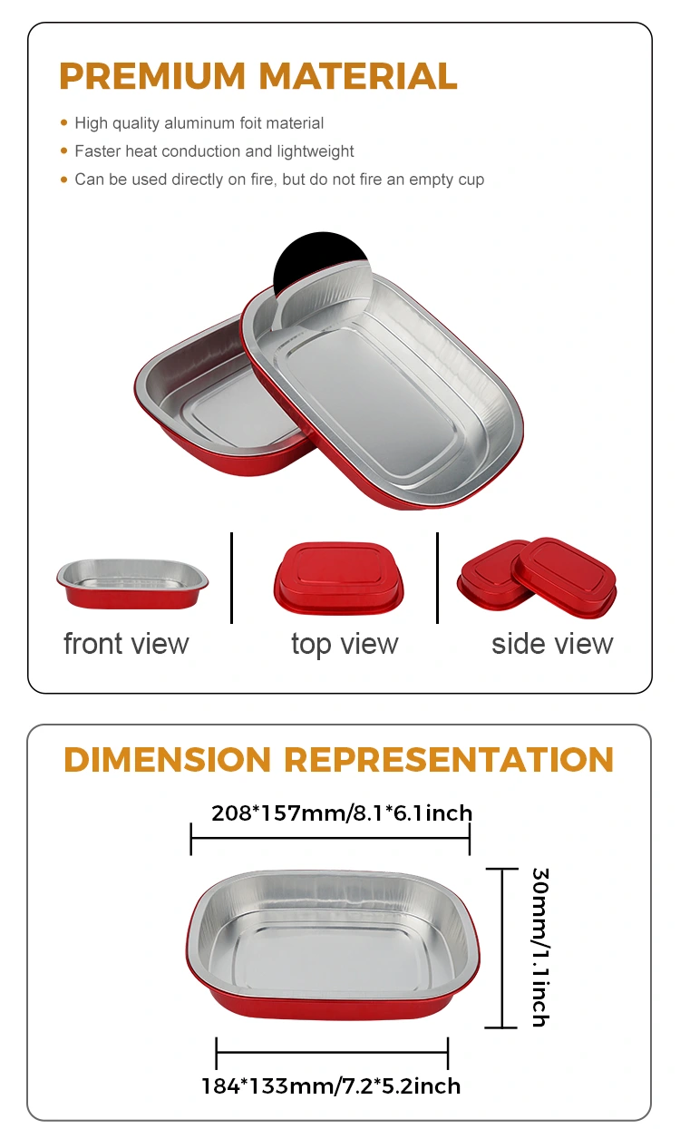 Yunchu là nhà sản xuất và cung cấp Thùng nhôm chuyên nghiệp tại Trung Quốc. Hộp đựng bằng nhôm hình vuông dùng một lần màu đỏ mà chúng tôi cung cấp cho bạn có đường kính 208 * 157 mm (8,1 * 6,1 inch). Đường kính dưới là 184*133 (7,2*5,2 inch), chiều cao là 30 (1,1 inch) và dung tích khoảng 680 ml (23,9OZ). Nó sử dụng vật liệu đế dày lá nhôm cấp thực phẩm 8011, có tính đến cả độ bền và khả năng chịu tải, không dễ bị biến dạng hoặc rò rỉ và có thể hỗ trợ trực tiếp cho thực phẩm. Nó tương thích với phạm vi nhiệt độ cực rộng từ -20oC đến 220oC. Không cần phải tháo khuôn. Có thể cho trực tiếp vào lò nướng, nồi chiên không khí hoặc nồi hấp để sử dụng và cũng có thể cho vào tủ lạnh để bảo quản. Nó mang đến trải nghiệm tiện lợi một cửa về "nướng - bảo quản - tiêu thụ - thải bỏ". Ưu điểm cốt lõi của lá nhôm là tính dẫn nhiệt cao. Lớp phủ vàng giúp thu nhiệt, đảm bảo thức ăn được làm nóng đều và nhanh chóng.
