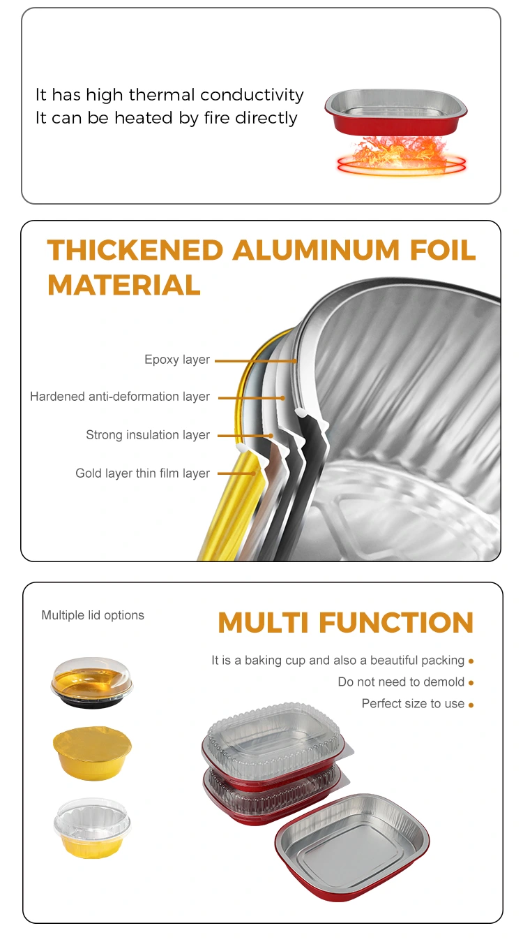 Cho dù bạn là một thợ làm bánh mới bắt đầu nướng bánh quy và bánh trứng, hay một người chơi nâng cao nướng mì ống và cá nguyên con, Hộp đựng bằng nhôm hình vuông dùng một lần màu đỏ có thể được điều chỉnh một cách hoàn hảo. Không cần phải chải dầu trước. Nguyên liệu có thể cho trực tiếp vào làm bánh. Sau khi ra khỏi lò, chúng có thể được bày ra đĩa trực tiếp, loại bỏ những rắc rối khi lấy khuôn ra và làm sạch khay nướng. Vẻ ngoài vàng óng làm cho món nướng trở nên tinh tế hơn. Nướng một khay nướng vàng gồm bánh quy nam việt quất và gà nướng trong lễ hội ngay lập tức tràn ngập không khí đoàn tụ. Chụp ảnh và chia sẻ nó trên các nền tảng truyền thông xã hội sẽ rất bắt mắt.