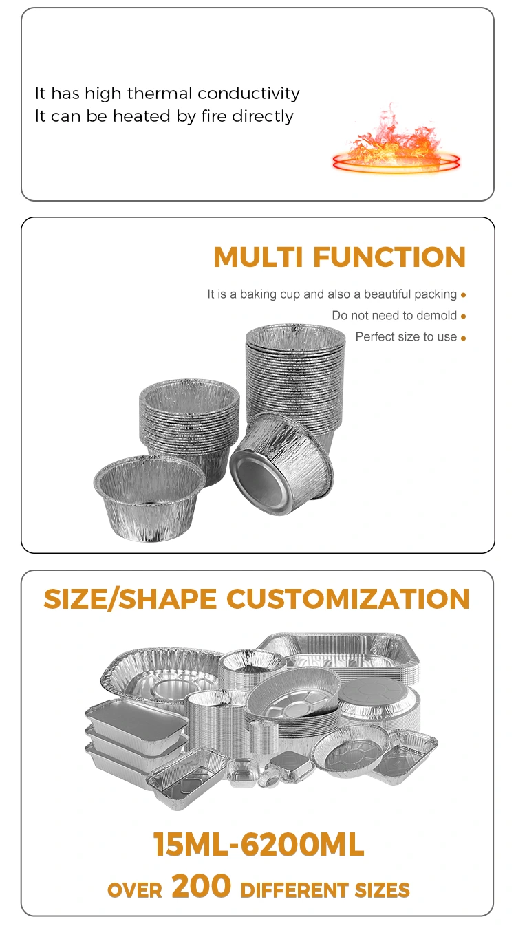 Nhà sản xuất giấy nhôm Yunchu đã cho ra mắt Khay đựng bánh tròn dùng một lần Hộp đựng giấy nhôm bạc, sử dụng thiết kế cốc nướng tròn và có các rãnh ở phía dưới giúp khay đứng ổn định và có tác dụng chống trượt. Hộp đựng này không cần phải làm sạch và có thể vứt đi sau khi sử dụng, rất tiện lợi và nhanh chóng. Nó dẫn nhiệt nhanh, không dễ cháy và dính vào đáy, được trang bị thiết kế cạnh. Nó được làm bằng vật liệu dày, chắc chắn và bền, không dễ bị hư hỏng, chống dầu và chống vết bẩn, và có thể dễ dàng tháo dỡ.