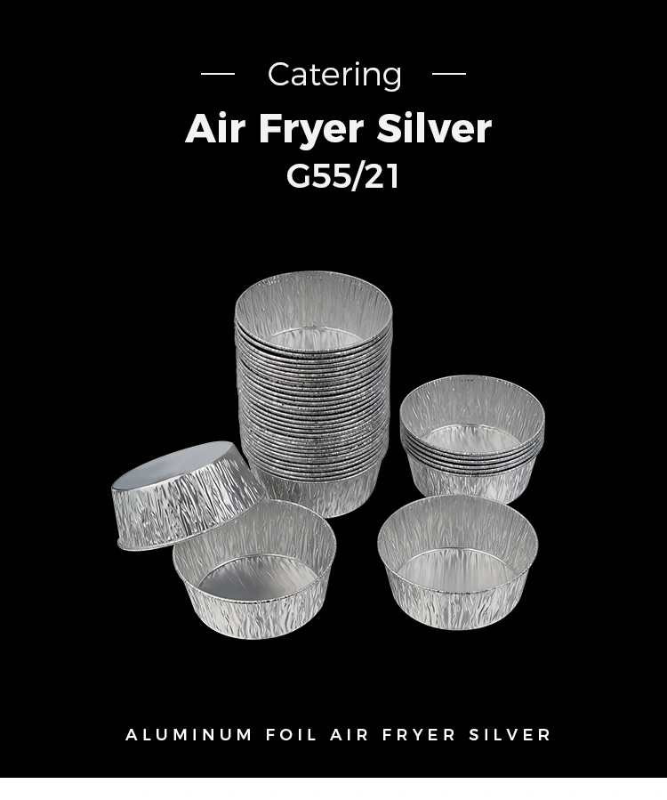 • Nồi chiên không khí nhúng tròn màu bạc dùng một lần Hộp đựng thực phẩm bằng lá nhôm bạcNồi chiên không khí nhúng tròn màu bạc dùng một lần Hộp đựng thực phẩm bằng lá nhôm bạc