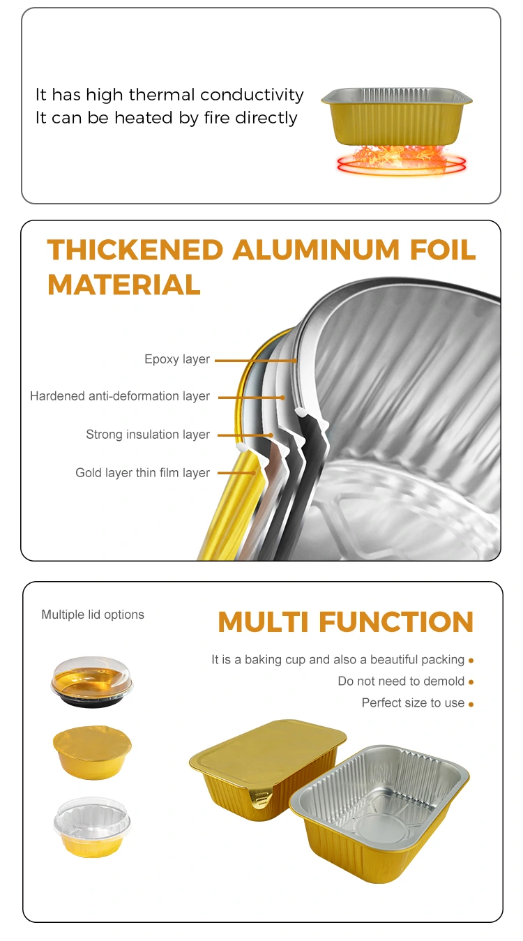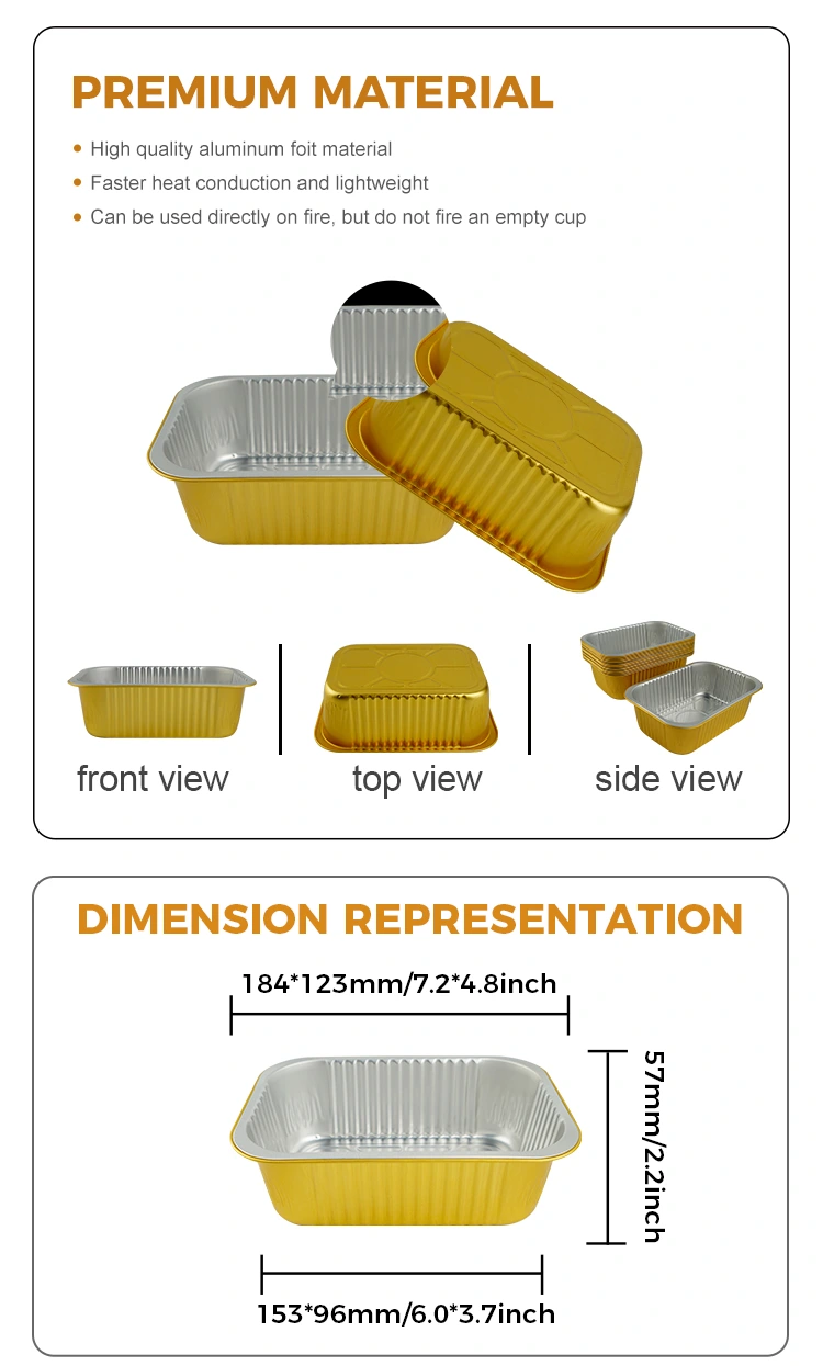 Nhà cung cấp giấy nhôm Yunchu Nhà cung cấp hình vuông có thể sử dụng các hộp đựng lá nhôm gratin được làm cẩn thận bằng vật liệu lá nhôm cấp thực phẩm chất lượng cao, có thể được sử dụng với nắp niêm phong bằng nhôm, có hiệu suất niêm phong tuyệt vời, điện trở nhiệt độ cao, và khả năng chống rò rỉ. Nó được sử dụng rộng rãi trong các kịch bản khác nhau như đóng gói thực phẩm, sưởi ấm, làm lạnh và giao hàng. Bề mặt được thiết kế với một bức tường ánh sáng, và sự xuất hiện phẳng và mịn, thuận tiện cho việc niêm phong tự động của màng niêm phong nhiệt, để cải thiện hiệu quả đóng gói.