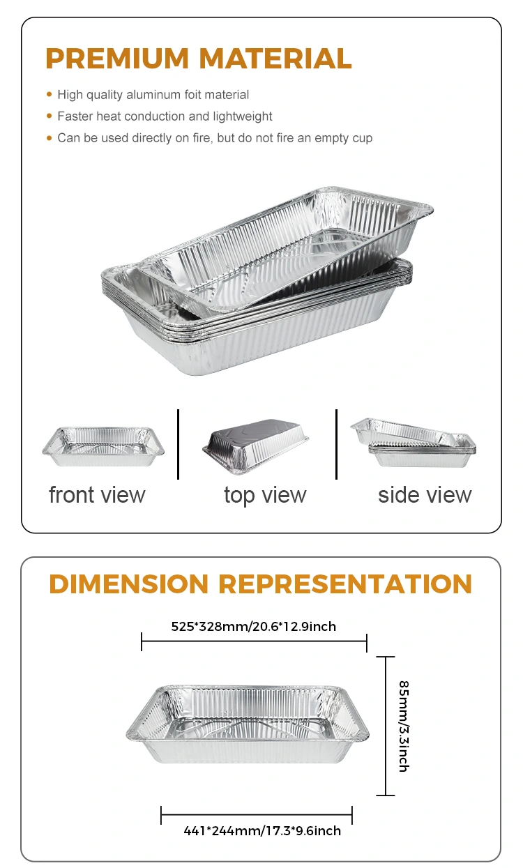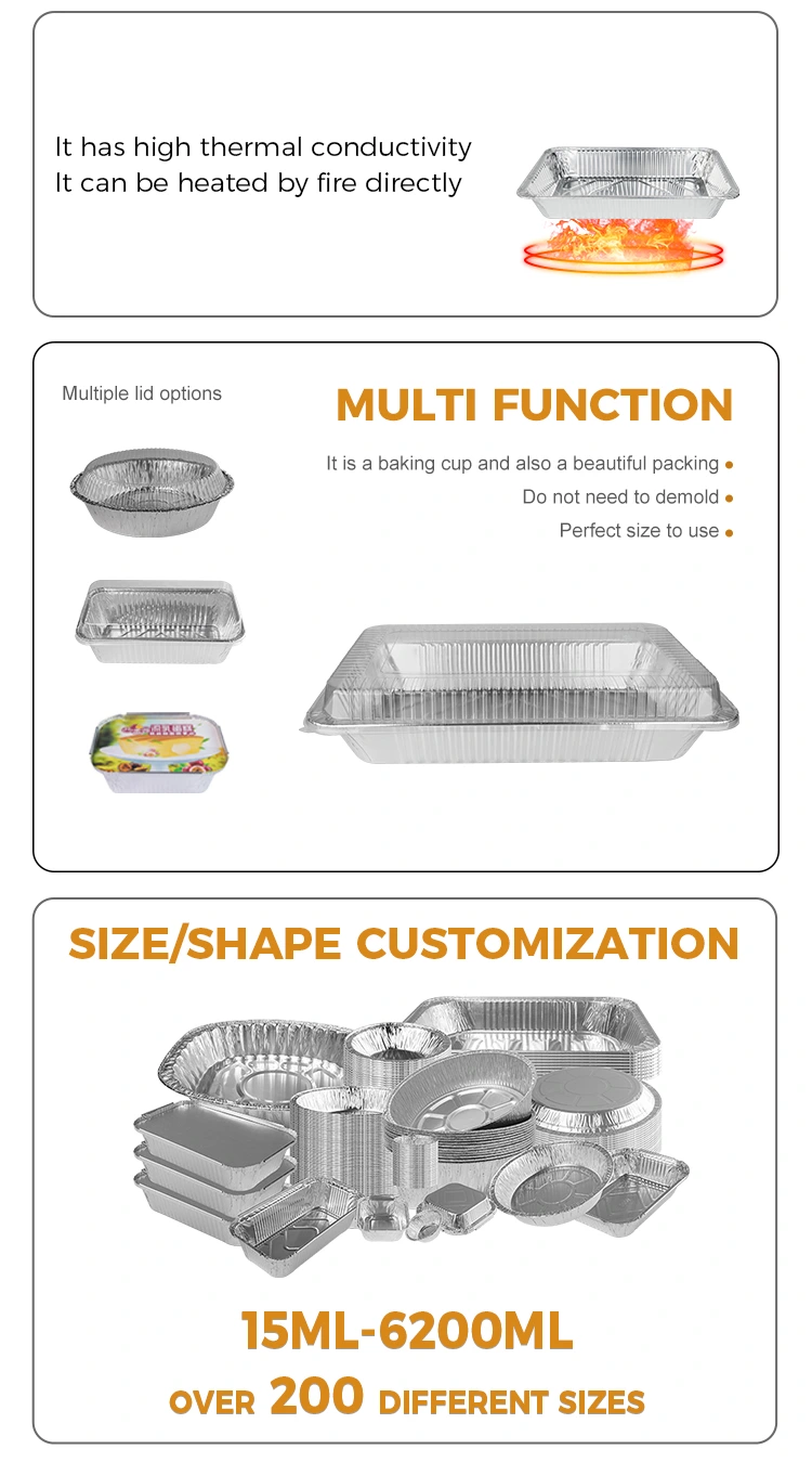 Các tính năng: Khả năng lớn của Bakes Baking Baking Pan Silver Container được làm bằng vật liệu lá nhôm 8011-0 cấp thực phẩm, đáp ứng đầy đủ tiêu chuẩn tiếp xúc cấp thực phẩm, đảm bảo an toàn thực phẩm mà không có mùi đặc biệt và đảm bảo hơn để sử dụng. Nó có một thiết kế bên trong lõm và lồi, an toàn hơn để sử dụng. Các thiết bị không được làm sạch và bảo vệ tốt thiết bị. Cho dù nướng hay sưởi ấm trên ngọn lửa mở, không cần phải lo lắng về biến dạng container hoặc ảnh hưởng đến an toàn thực phẩm.