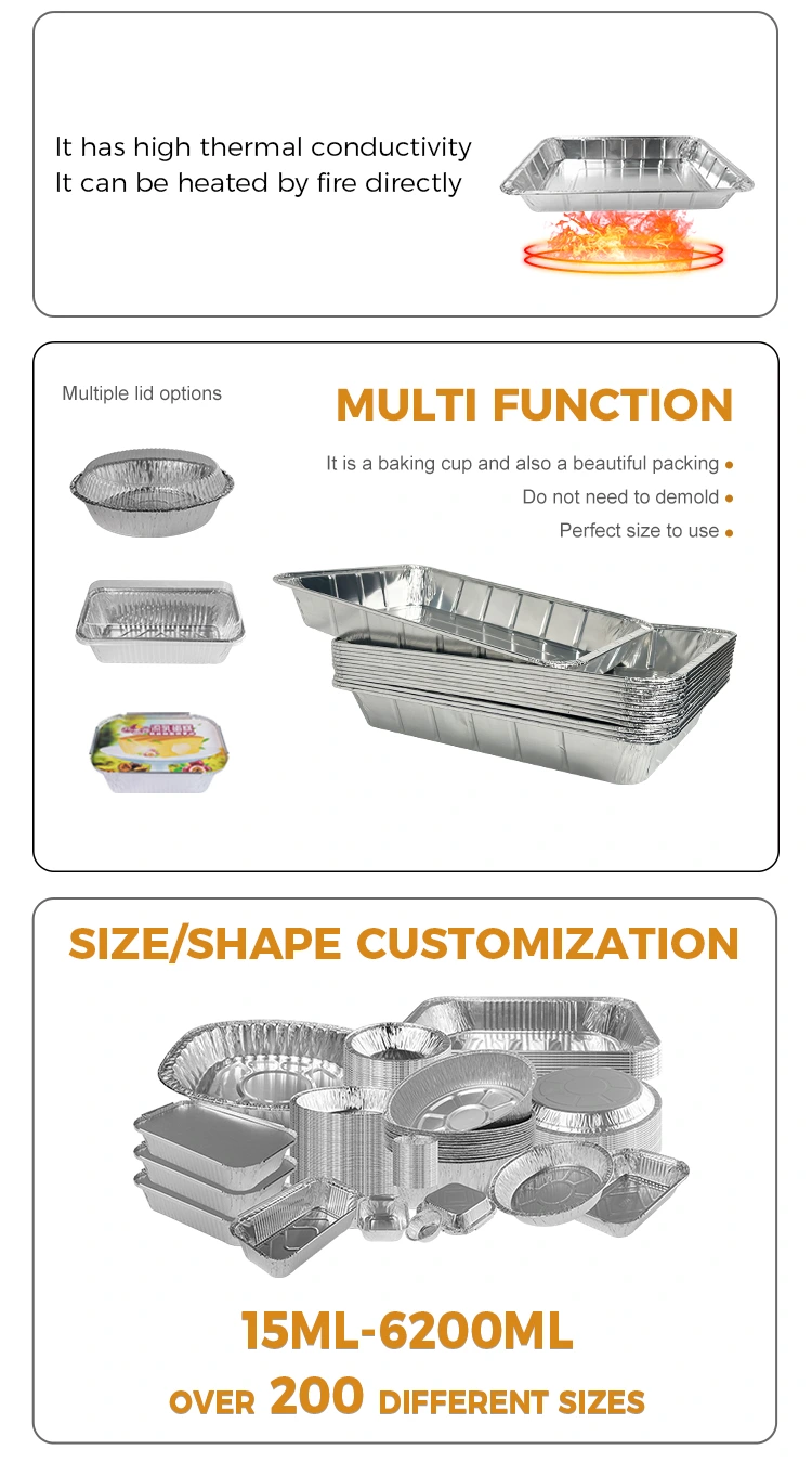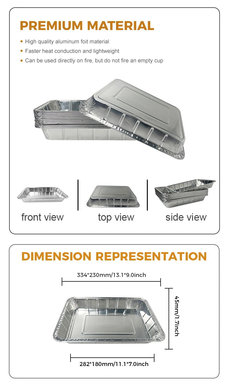 Nhà cung cấp lá nhôm Yunchu lớn cá nướng lớn Takeaway Silver Silver Foiler Container, đáp ứng nhiều nhu cầu nấu ăn, phù hợp cho nhiều dịp khác nhau như cá rán không khí, nướng thịt nướng, lò nướng rotisserie và làm hải sản. Hộp đựng lá nhôm này được thiết kế đặc biệt với cạnh nâng lên để ngăn chặn thực phẩm tràn ra và dính vào tường nồi, và bảo vệ lớp lót pan với nhiều lớp, thực tế và không lo lắng. Nó được làm bằng vật liệu 8011-0 cấp thực phẩm, với nhiệt độ chịu nhiệt lên tới 520 ° C, không bị cháy sém hoặc bị hỏng, và vật liệu làm dày làm cho nó không dễ biến dạng. Hộp giấy nhôm được làm dày nói chung, vì vậy bạn có thể dễ dàng nhặt nó sau khi nấu mà không phải lo lắng về biến dạng trong khi sử dụng. Thiết kế được viền giúp thoải mái khi giữ và các cạnh được làm tròn, vì vậy bạn không phải lo lắng về việc gãi ngón tay. Các cạnh mịn được bổ sung bởi các nắp nắp trong suốt hoàn toàn trong suốt và nắp giấy nhôm, làm cho chúng phù hợp hơn với nhiều phương pháp nấu ăn.