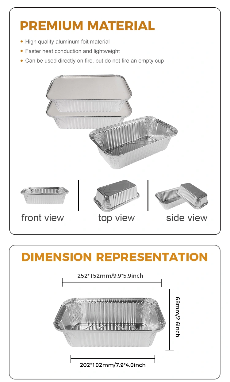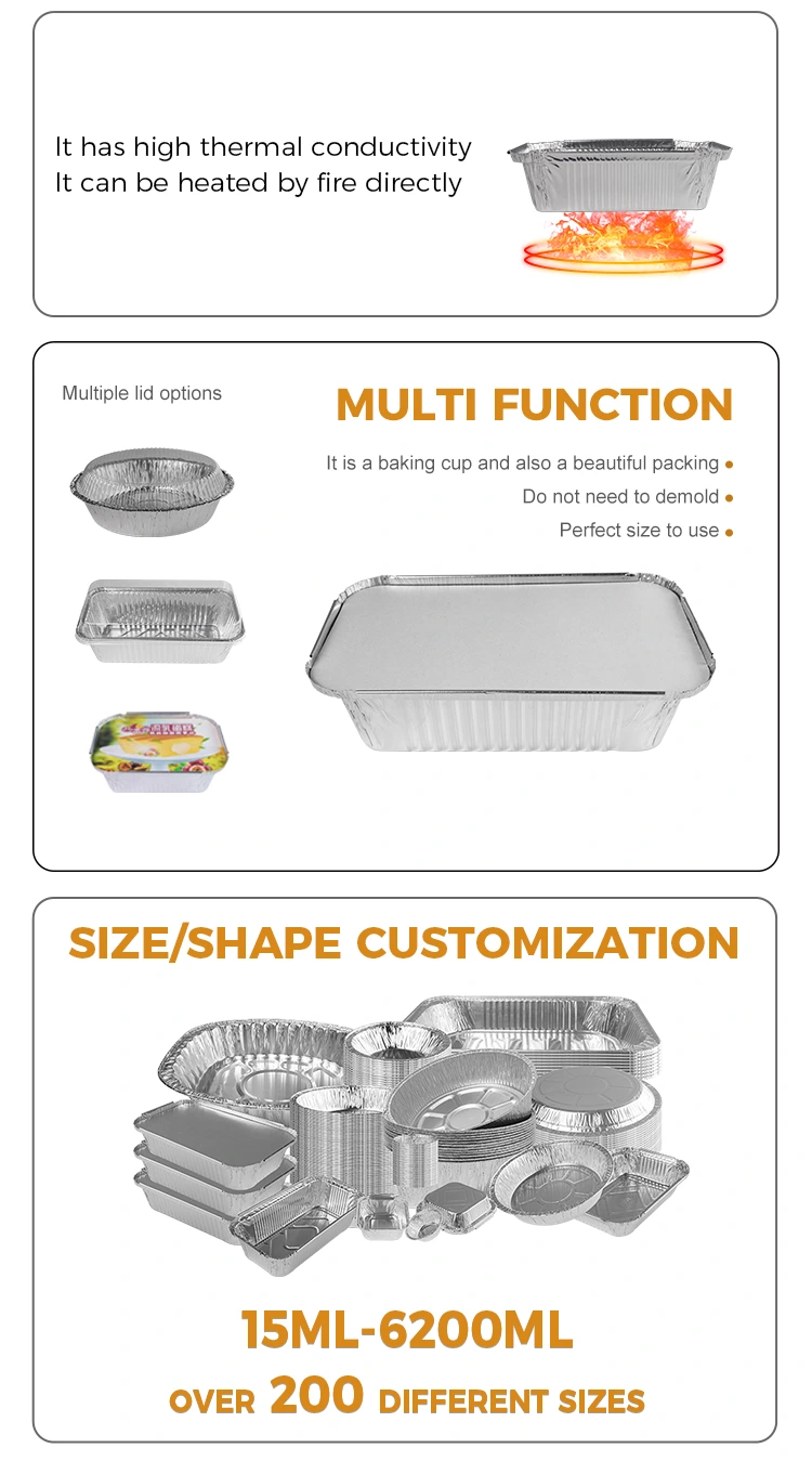 Lá nhôm Yunchu này đóng gói các thùng chứa nhôm bạc hình chữ nhật được làm bằng vật liệu lá nhôm 8011 chất lượng cao, có hiệu suất cách nhiệt tuyệt vời và có thể duy trì hiệu quả nhiệt độ của thực phẩm, làm cho thực phẩm trở nên ngon và ngon hơn. Đồng thời, hộp đựng giấy nhôm BBQ BBQ hình chữ nhật của chúng tôi cũng được trang bị chức năng bảo quản nhiệt, có thể đạt được bằng cách kết hợp nó với nắp giấy nhôm hoặc nắp nhựa PET, thuận tiện cho logo tùy chỉnh và do đó tăng cường hình ảnh thương hiệu.
