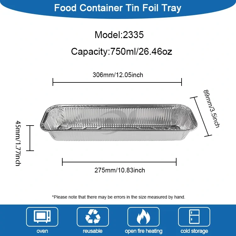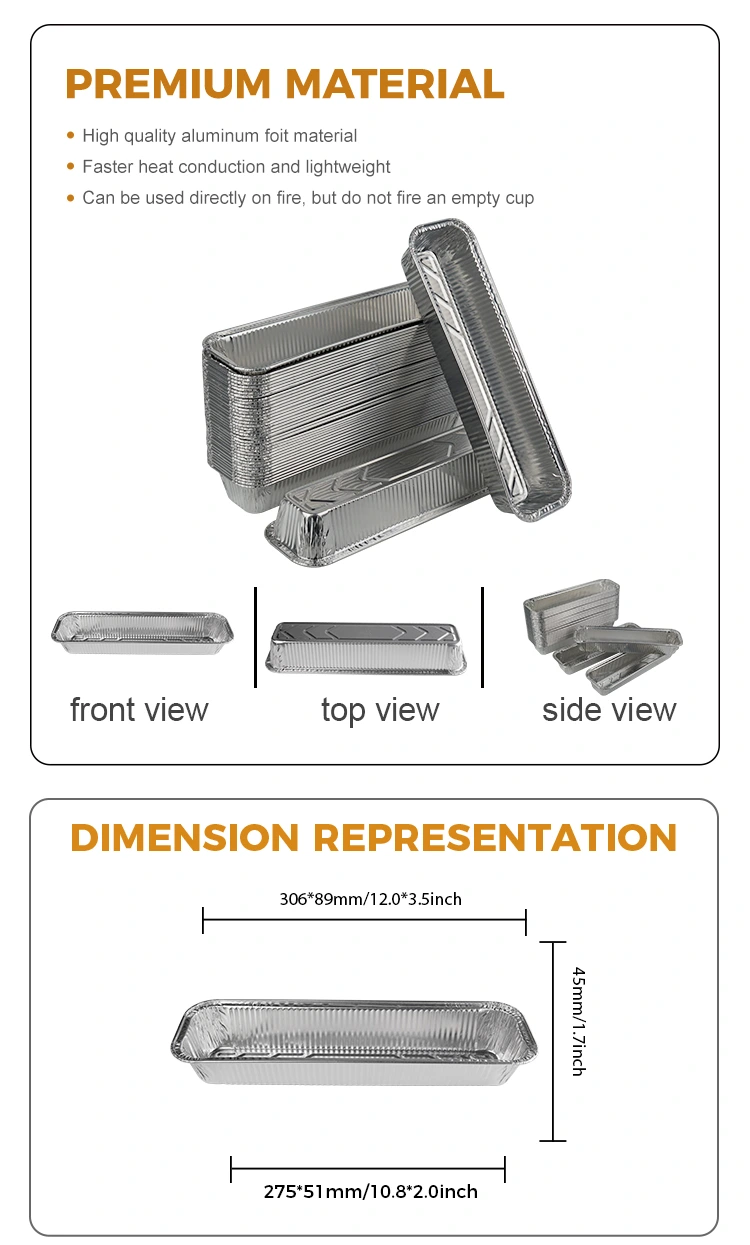 Các hộp đựng lá nhôm bằng bạc hình chữ nhật được cung cấp bởi nhà cung cấp lá nhôm Yunchu được làm bằng vật liệu cấp thực phẩm và phù hợp cho nhiều kịch bản ứng dụng. Sản phẩm này đặc biệt phù hợp cho mục đích nướng và nướng, chẳng hạn như làm những ổ bánh mì dài hoặc nướng. Cho dù đó là để nướng than hay như một hộp giao hàng mang đi, nó hoàn hảo để sử dụng.