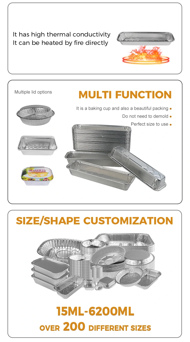 Các thùng chứa bằng nhôm khay bằng bạc hình chữ nhật này trải qua thử nghiệm chất lượng nghiêm ngặt để đảm bảo rằng không có chất có hại nào được giải phóng trong quá trình sưởi ấm ngọn lửa mở và người dùng không cần phải lo lắng về các vấn đề an toàn. Ngoài ra, thiết kế thân thiện với môi trường và bền bỉ của nó không chỉ đảm bảo vận chuyển sản phẩm an toàn mà còn duy trì sự xuất hiện tốt nhất. Thiết kế lõm và lồi ở phía dưới giúp tăng cường các đặc tính chống trượt của sản phẩm, trong khi các chất làm cứng được thêm vào ở hai bên làm tăng độ cứng của sản phẩm. Thiết kế hemming được làm dày và sâu hơn, với khả năng chịu nhiệt độ cao và độ dẫn nhiệt, có thể đạt được sự gia nhiệt đồng đều và không có mùi đặc biệt, khiến nó rất phù hợp để sử dụng trong nhiều kịch bản như nướng than, bánh mì dài và giao hàng.