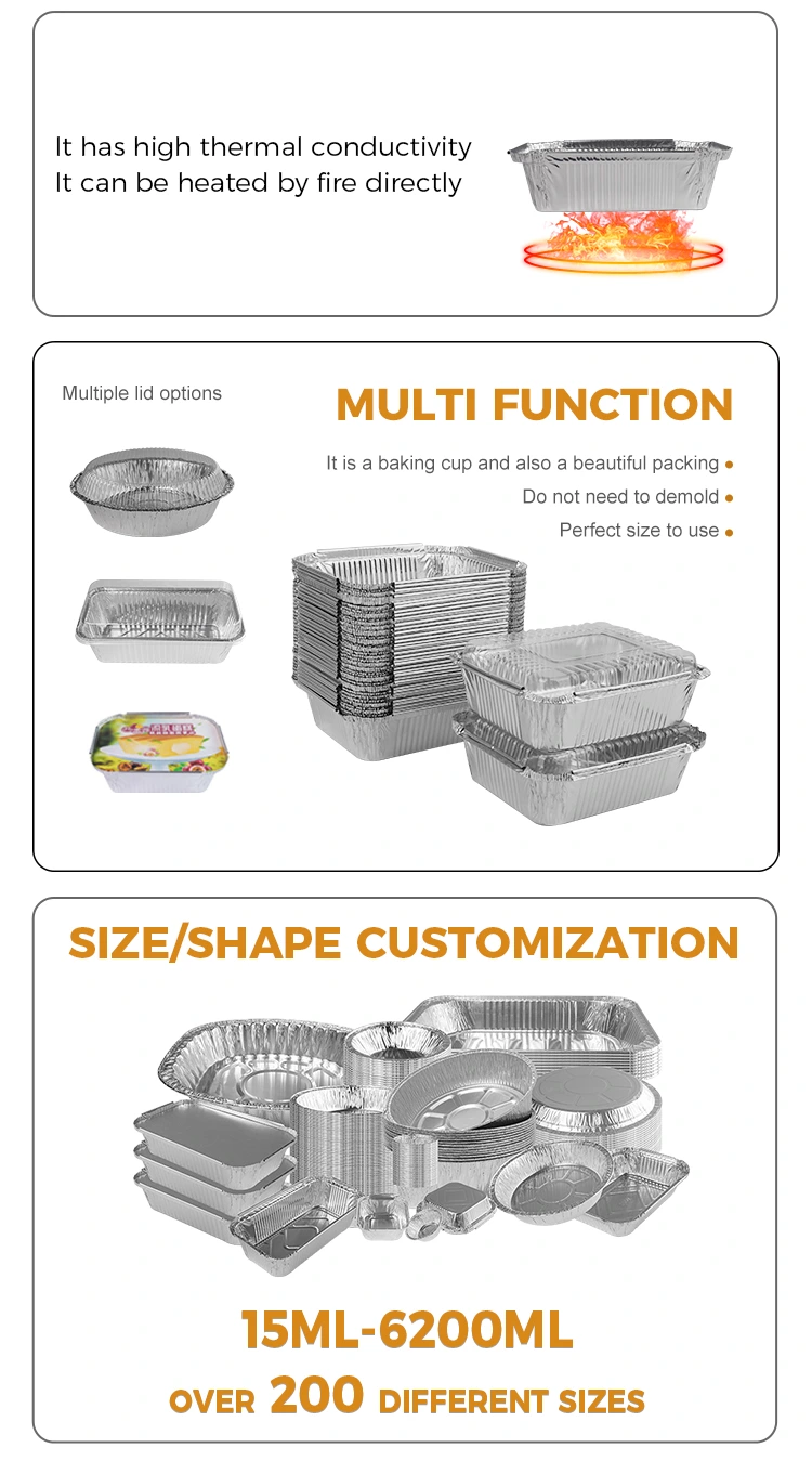 Các gratin hình chữ nhật được đóng gói các thùng chứa nhôm bạc được cung cấp bởi nhà cung cấp lá nhôm yunchu được làm bằng vật liệu bạc cấp thực phẩm 8011-0 chất lượng cao. Container này phù hợp cho nhiều phương pháp nấu ăn như món cháo không khí, tiệc nướng, nướng, và các món ăn được làm sẵn, và có thể nhanh chóng làm nóng thức ăn cho cuộc sống hàng ngày. Nó rất linh hoạt, vật liệu mạnh và bền, và nó không dễ bị biến dạng hoặc phá vỡ. Nhờ thiết kế dày lên, hộp đựng lá nhôm này có thể chịu được hệ thống sưởi ngọn lửa mở, đảm bảo an toàn cho người tiêu dùng và có khả năng chịu nhiệt độ và độ ẩm tốt, làm cho nó phù hợp để vận chuyển an toàn.