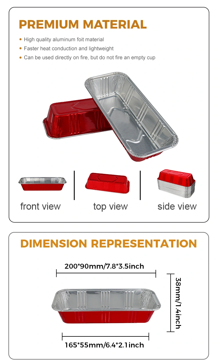 Hộp đựng bằng nhôm lá nhôm hình chữ nhật màu đỏ dành cho nhà cung cấp giấy nhôm Yunchu của nhà cung cấp giấy nhôm có thiết kế bền, an toàn với lò nướng. Chúng vẫn ổn định ngay cả dưới nhiệt độ cao và ngọn lửa trần, chịu được nhiệt độ trên 220oC, cung cấp sự phân bổ nhiệt đều để ngăn ngừa cháy xém và có khả năng bịt kín chắc chắn để giữ độ tươi (ngăn không khí và hơi ẩm, giữ cho bánh mì mềm ngay cả sau khi để nguội). Họ cũng cung cấp lợi thế về môi trường và thẩm mỹ. Được làm bằng lá nhôm cấp thực phẩm, chúng đáp ứng các tiêu chuẩn tái chế bao bì và có thể được tái chế thông qua các kênh hợp pháp sau khi thải bỏ, giảm gánh nặng môi trường của các hộp nhựa sử dụng một lần. Hình dạng thon dài vừa vặn chính xác với kích thước của ổ bánh mì dài, duy trì hình dạng của bột và ngăn ngừa sự giãn nở và biến dạng trong quá trình nướng. Điều này đảm bảo bánh mì vẫn giữ được hình dáng nguyên vẹn, thon dài sau khi nướng, giúp trưng bày sản phẩm hấp dẫn hơn, đặc biệt phù hợp với các cơ sở thương mại.