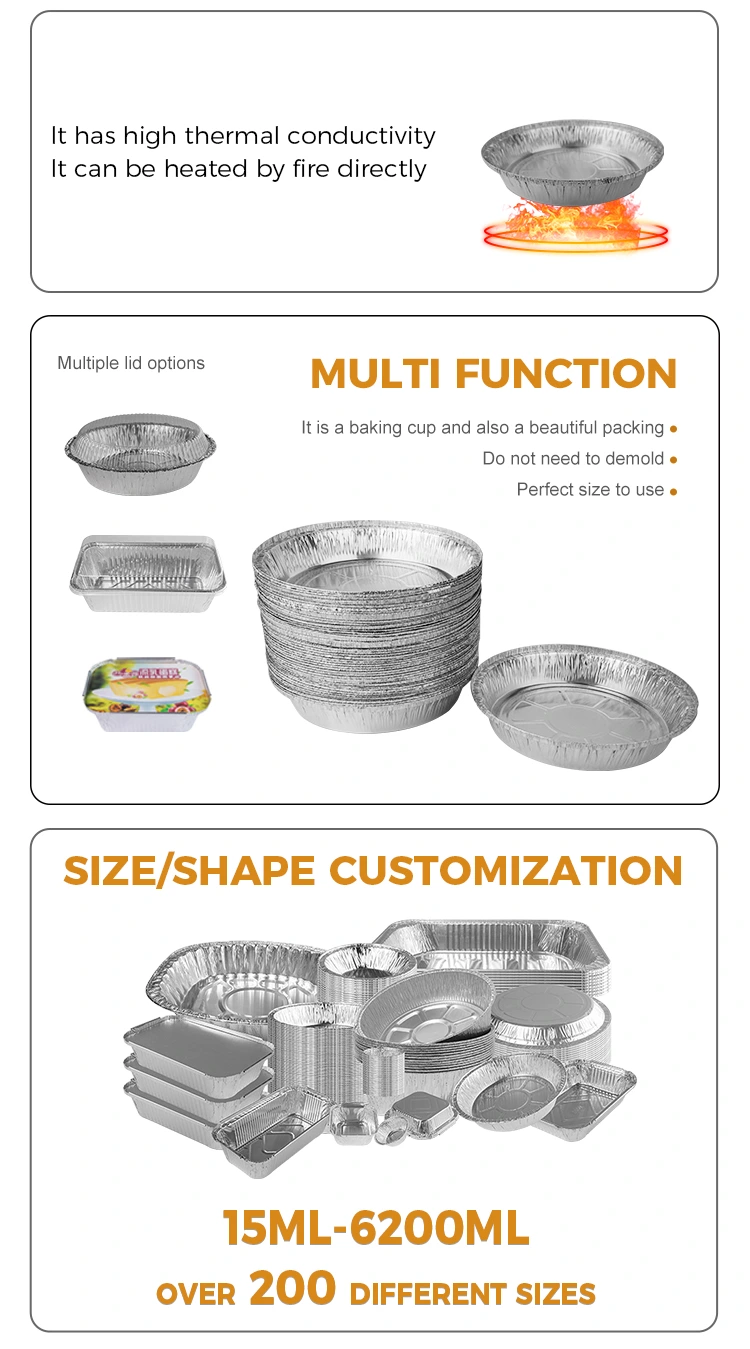 Nhà cung cấp lá nhôm Yunchu sản xuất các hộp đựng bằng nhôm bằng nhôm, hộp đựng bằng nhôm bằng nhôm, chất liệu đã được làm dày, tiếp xúc trực tiếp với an toàn thực phẩm và không khí. -20 ° C ~ 250 ° C không thể được dán hoặc bị hỏng, chọn các vật liệu chất lượng cao dày, bảo vệ môi trường cấp thực phẩm và không có ô nhiễm, sử dụng nhiều hơn. Các hộp đựng bằng nhôm lò nướng bằng không khí không khí phù hợp cho các cảnh như nhà hàng, ăn uống căng tin, chuỗi cửa hàng, thực phẩm lạnh, takeaway, v.v ... Cho dù sử dụng bán buôn hay bán lẻ, chảo nướng này đã giúp bạn được bảo hiểm. Khay nướng có khả năng chịu tải và độ bền nhất định, và có thể duy trì hình dạng của nó ngay cả khi xếp chồng lên nhau, và không dễ biến dạng trong quá trình vận chuyển. Để tăng cường hơn nữa trải nghiệm người dùng, người dùng cũng có thể chọn sử dụng nó với nắp giấy nhôm và nắp thú cưng trong suốt hoàn toàn.
