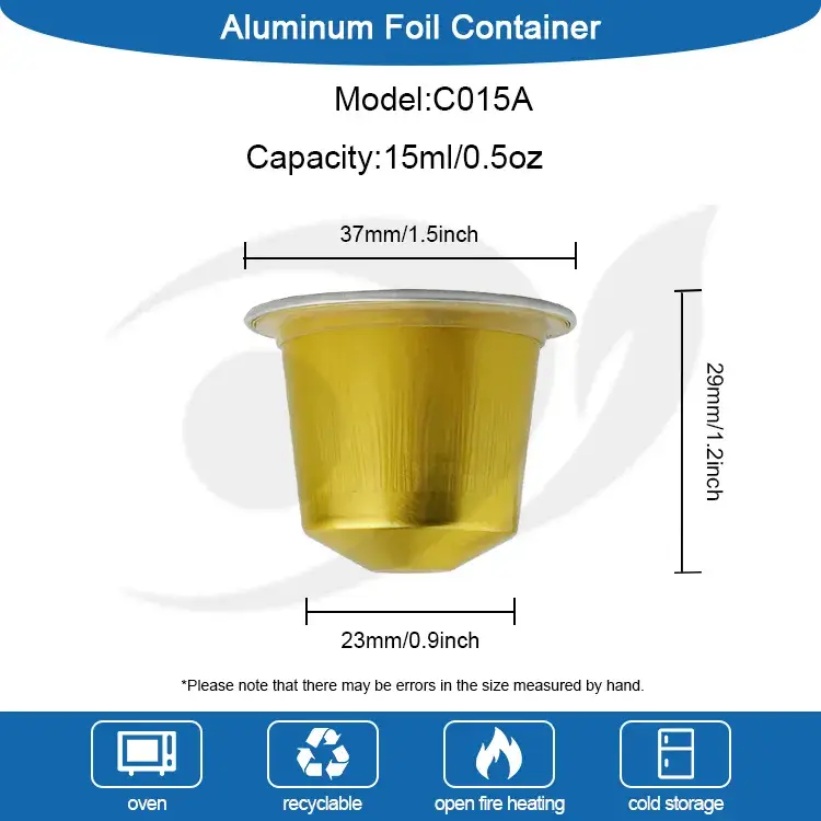 Nhà cung cấp Yunchu Aluminum Foil Nhà cung cấp silicone-seal Cà phê trống C015A Trong các kích cỡ sau: Đường kính trên cùng 37 mm (khoảng 1,4 inch), đường kính cơ sở 23 mm (khoảng 0,9 inch), chiều cao 29 mm (khoảng 1,1 inch). Viên nang này chứa 15 ml (khoảng 0,5 oz) cà phê xay, chất lỏng cà phê. Thích hợp cho tất cả các máy Nespresso, chất lỏng espresso đóng gói và thậm chí có thể được mở rộng với việc rửa nitơ. Ngoài ra, logo và màu sắc cũng có thể được tùy chỉnh và mẫu có thể được in trên nắp giấy nhôm và logo cũng có thể được đóng dấu ở dưới cùng của viên nang cà phê.