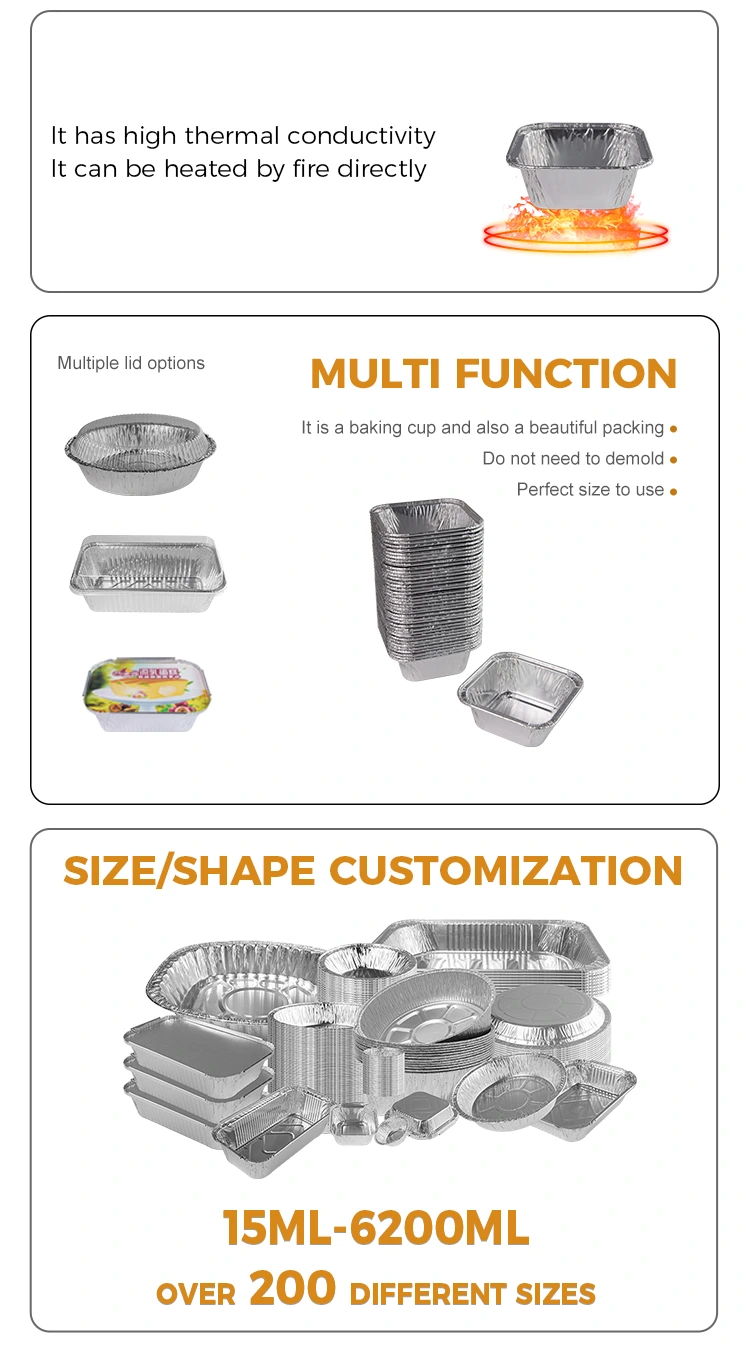 Hộp đựng bằng nhôm bằng bạc Fryer Squared sử dụng vật liệu giấy nhôm chất lượng cao, vừa nhẹ vừa bền. Phần trên có thể được tùy chỉnh với nắp trong suốt PET, và phía dưới có nắp được ép và cố định trong hộp để ngăn thực phẩm dính vào tấm nướng, dễ dàng giải phóng và dễ dàng, và dễ vận chuyển và sử dụng.