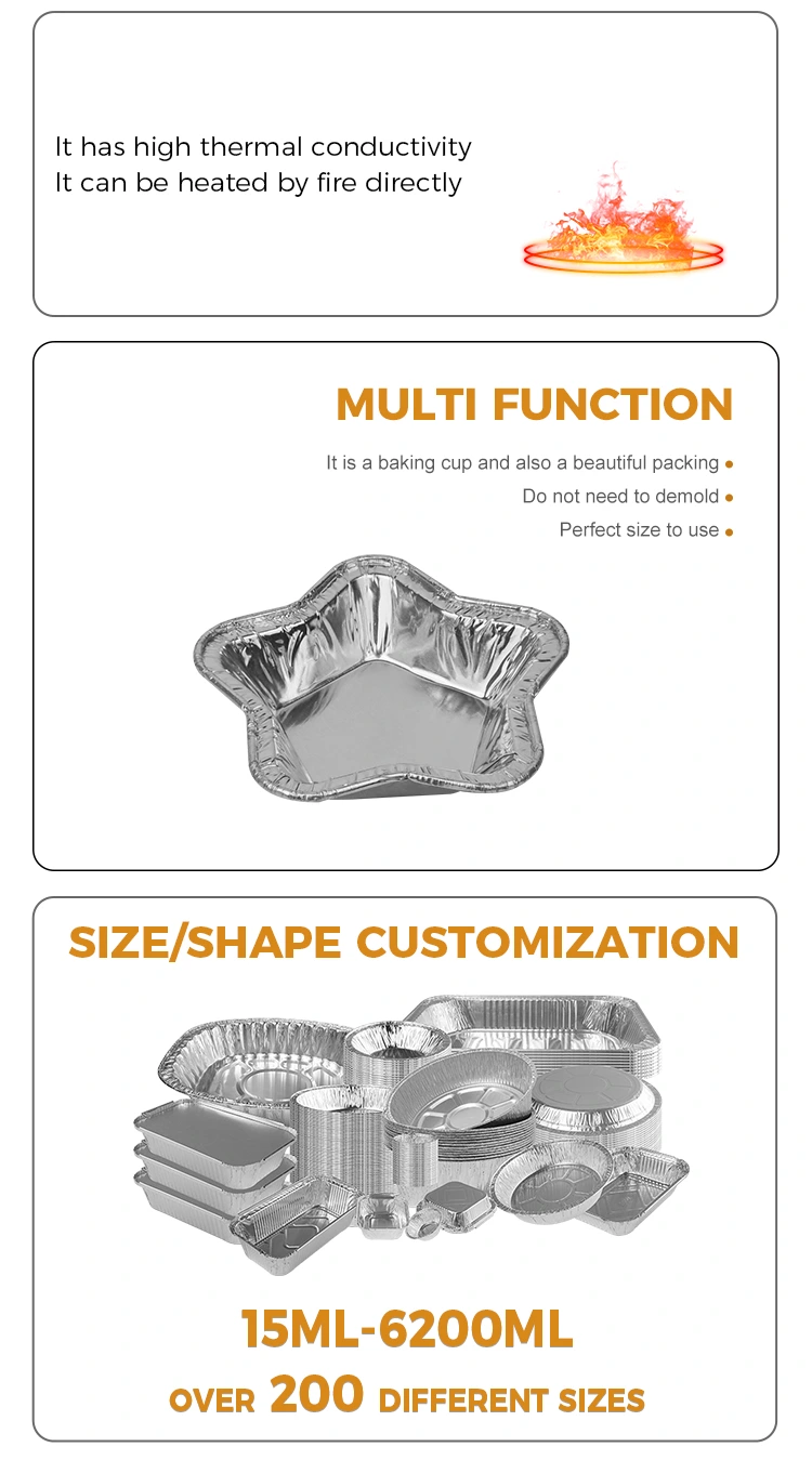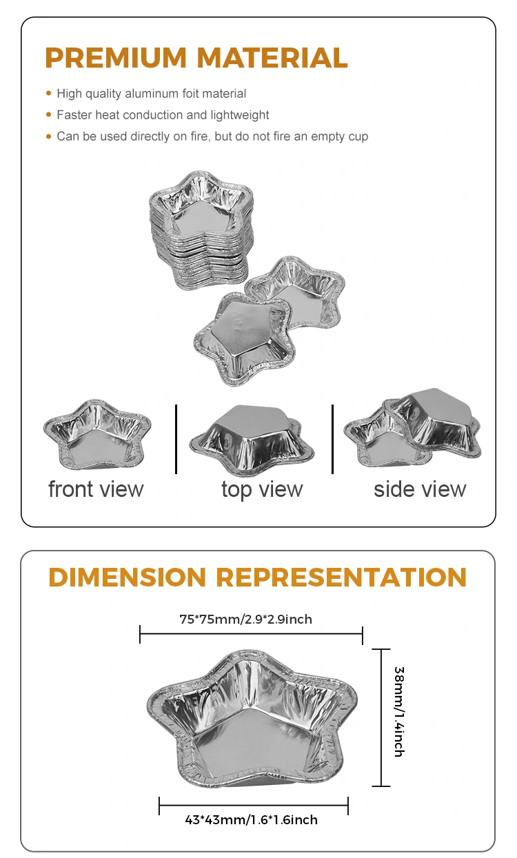 Cốc bánh tart lá nhôm hình ngôi sao được làm bằng lá nhôm bạc và có khả năng chịu nhiệt độ cao, ổn định trong khoảng từ -20°C đến 300°C. Chúng thích hợp để nướng và sử dụng nồi chiên không dầu, đồng thời có thể ngăn ngừa hư hỏng các thành bên trong của thiết bị. Chúng là loại dùng một lần, thuận tiện vì không cần vệ sinh.